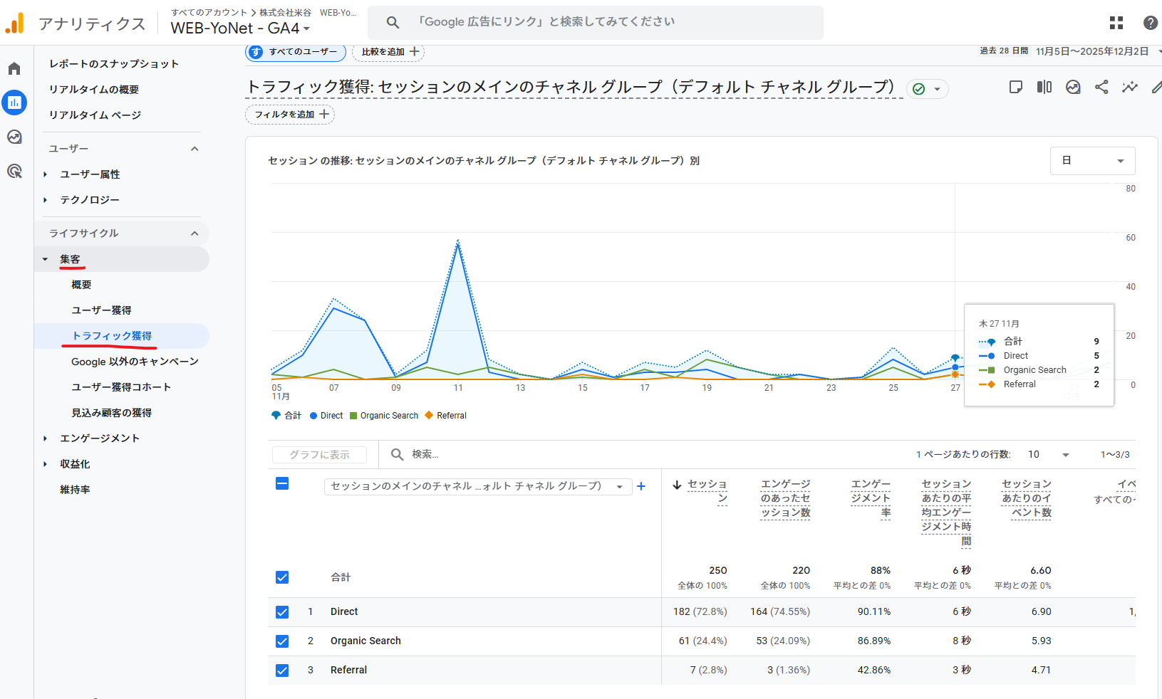 Googleアナリティクスを見て、どの経路(チャネル)からのアクセスが減っているかを確認しましょう。