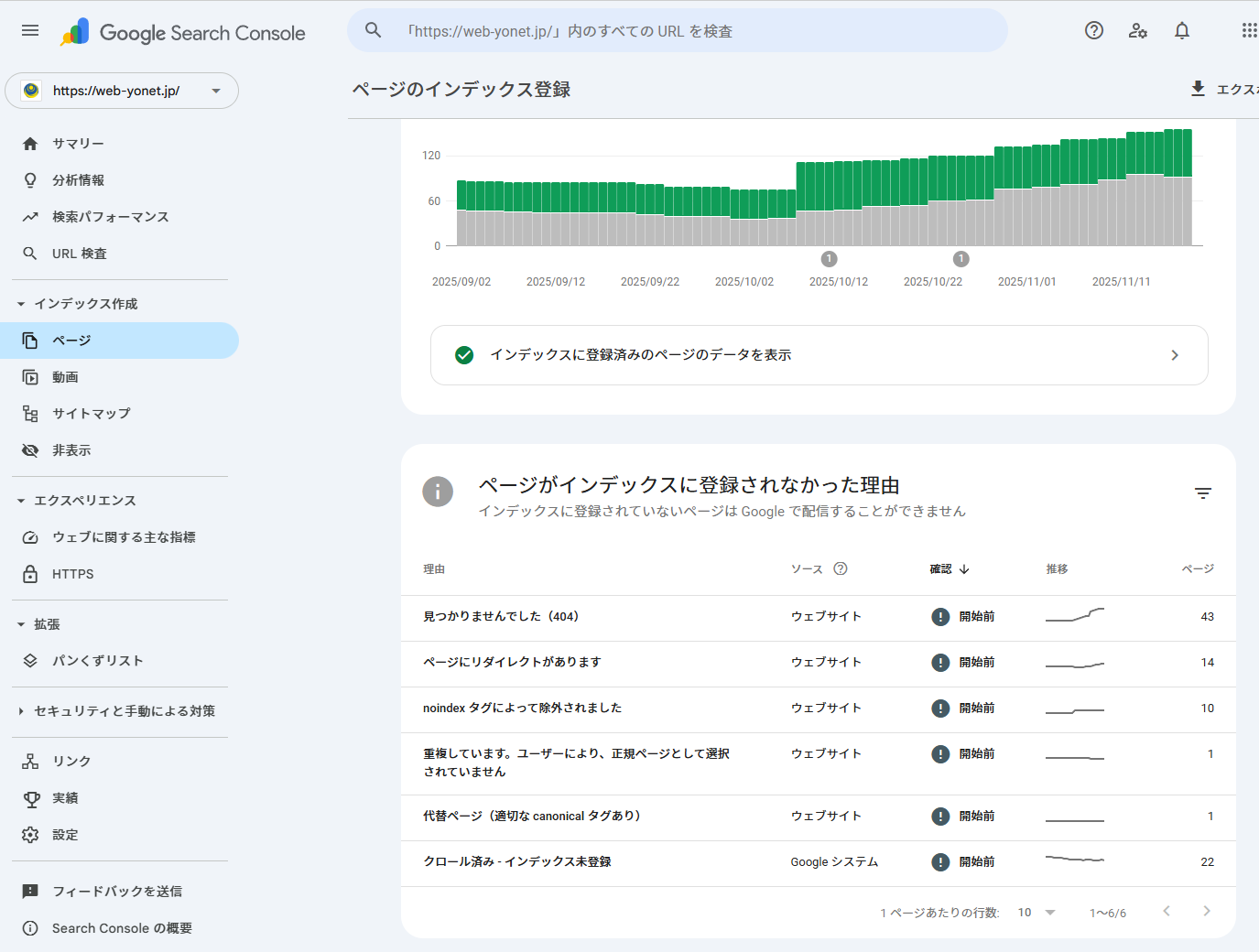 - 左メニューの「インデックス作成」>「ページ」をクリック