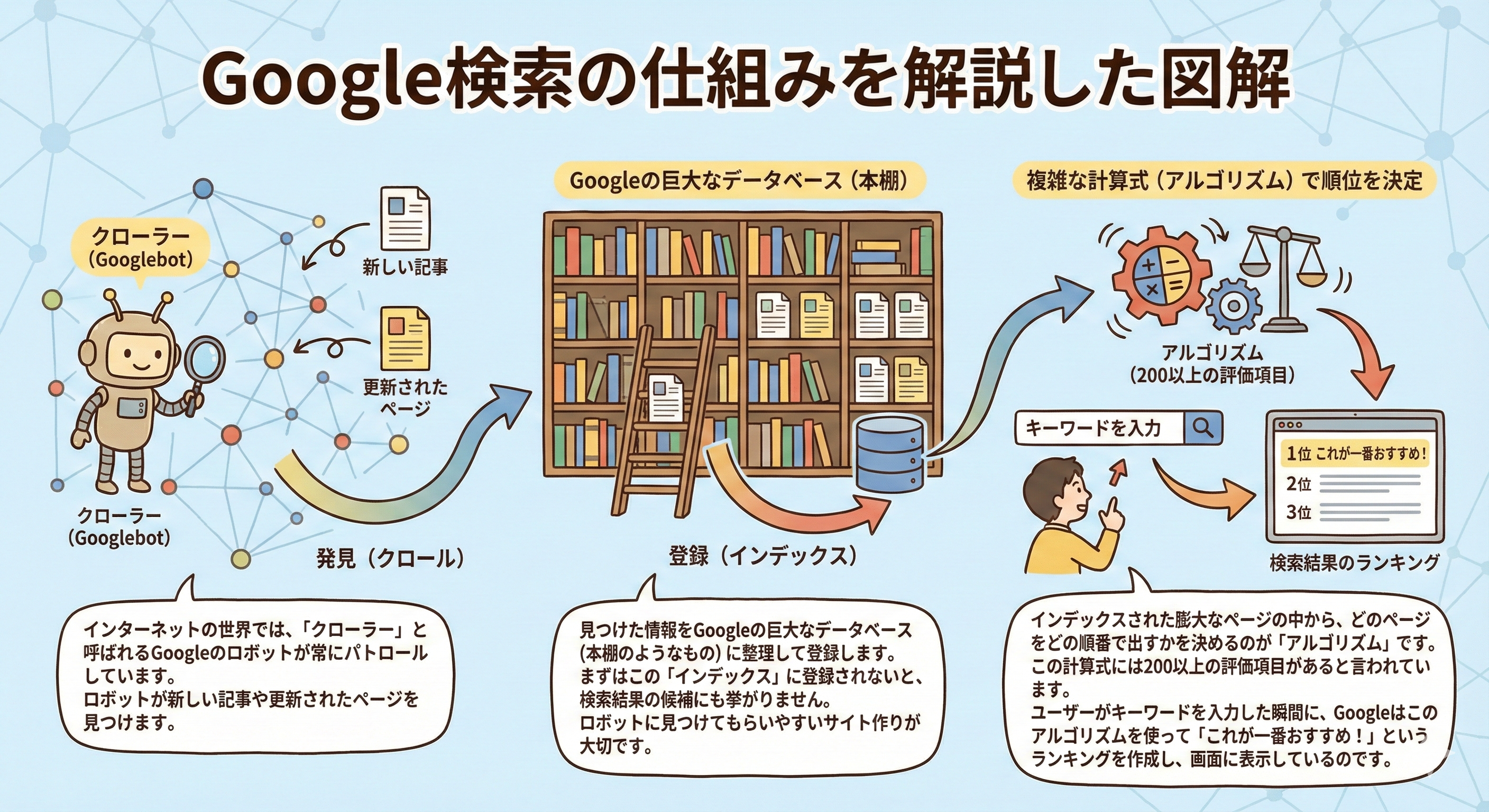 - 登録(インデックス):見つけた情報をGoogleの巨大なデータベース(本棚のようなもの)に整理して登録します。
