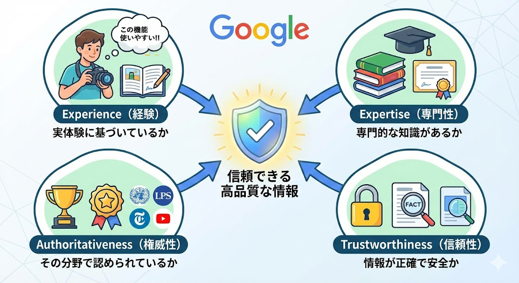 最も重要なのは、やっぱり「中身」です。最近Googleが特に重視しているのが「E-E-A-T」と呼ばれる基準です。