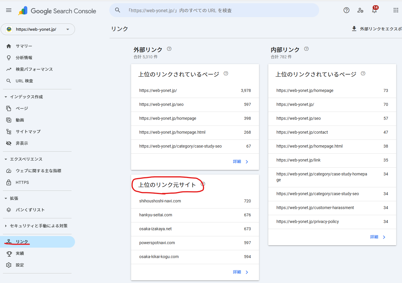 スパムリンクの確認に欠かせないのが、Googleが無料で提供している「Googleサーチコンソール」というツールです。まだ登録していない方は、ぜひこの機会に設定しておきましょう。サーチコンソールの管理画面を開き、左側のメニューから「リンク」をクリックします。
