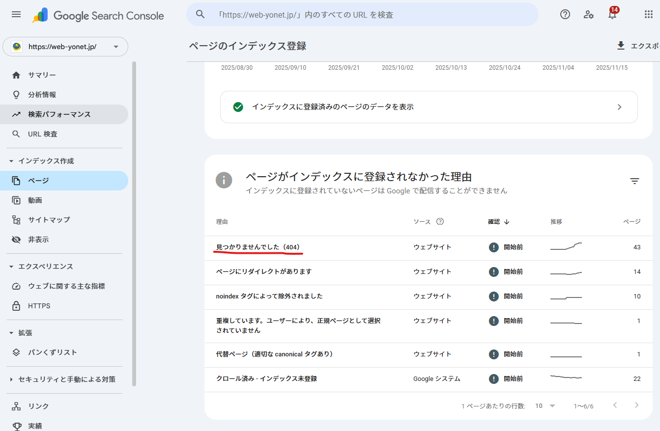 サーチコンソールのメニューにある「ページ」または「カバレッジ」を見ると、サイト内のエラー状況がひと目でわかります。
