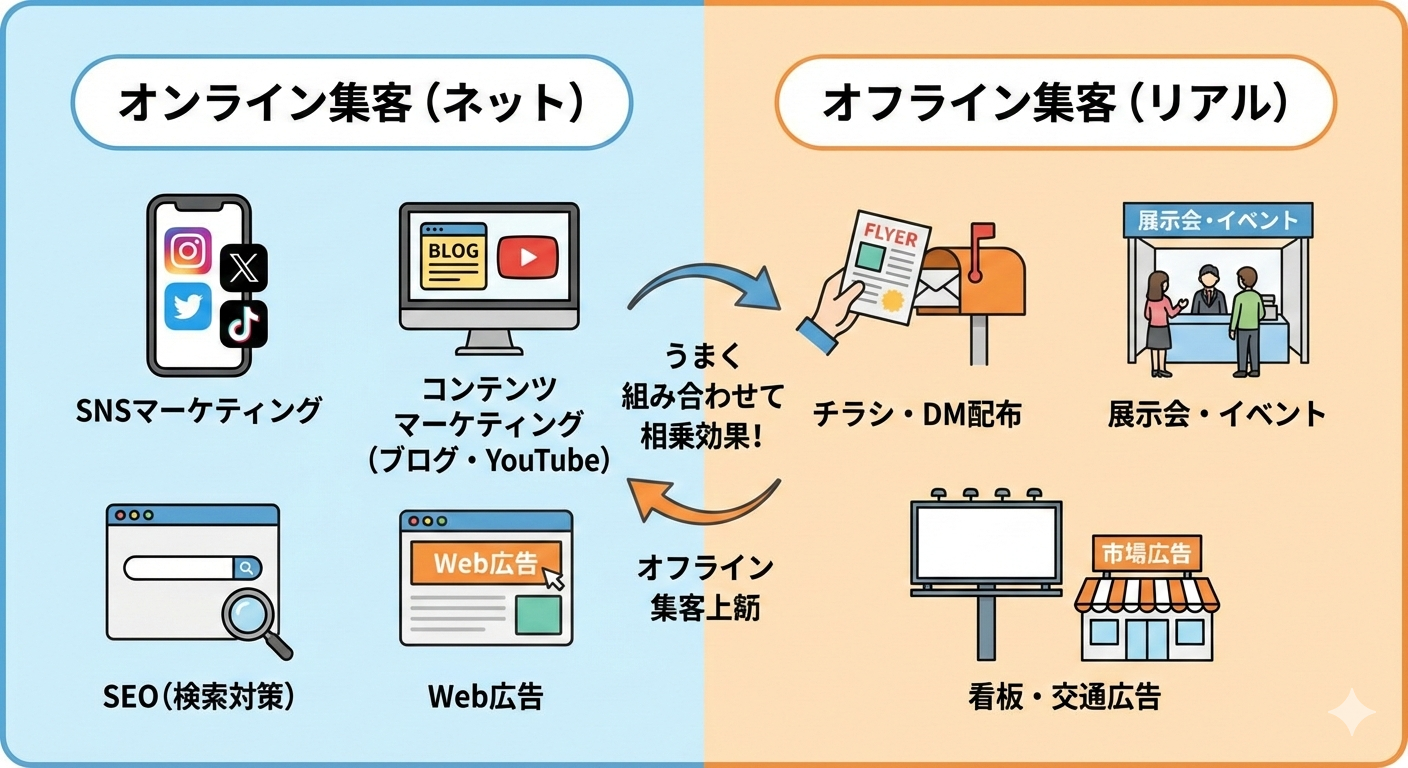 では、具体的にお客様を集めるにはどうすれば良いのでしょうか?大きく分けて「オンライン(ネット)」と「オフライン(リアル)」の2つのアプローチがあります。